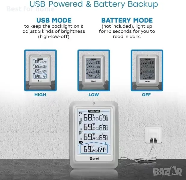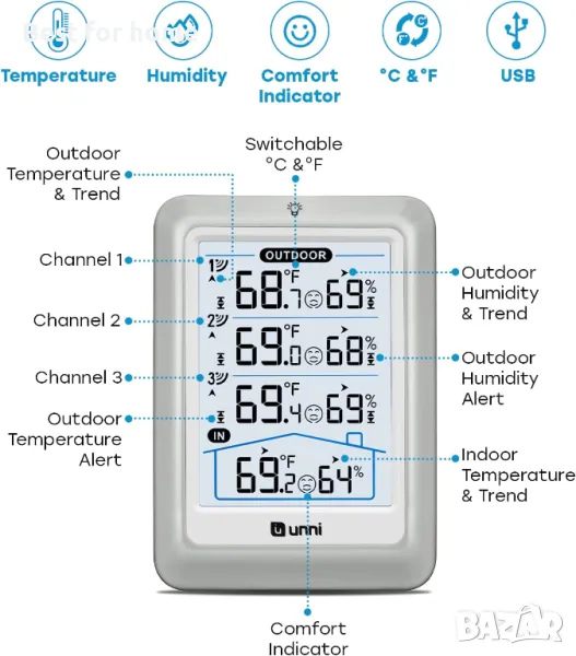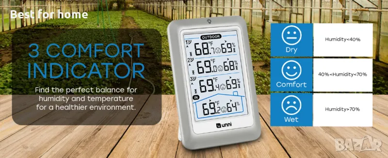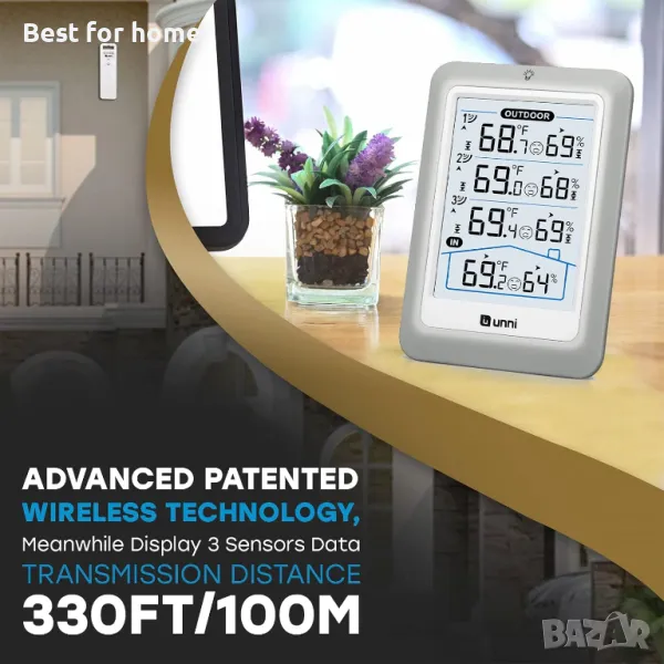 ДАННИ НА ДИСПЛЕЙ 3 СЕНЗОРА, ПРЕДАВАНЕ 328FT/100M – Unni има усъвършенствана патентована безжична технология, която осигурява по-мощно и стабилно предаване на данни. Безжичният монитор за температура и влажност актуализира и предава данни за температура и влажност до радиус от 330 фута на всеки 30 секунди, което ще ви помогне да наблюдавате всички места, които ви интересуват най-много.