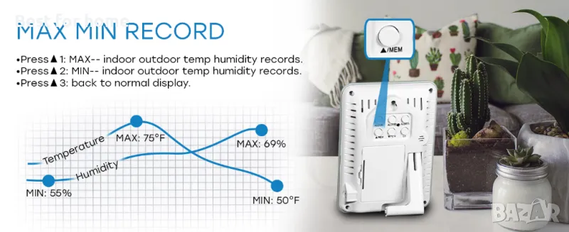 СПЕЦИАЛНИ ХАРАКТЕРИСТИКИ – Спрете да се тревожите за климата! Ще можете да знаете в реално време вътрешна и външна температура и влажност с тренд, превключваеми °C &°F, индикатор за комфорт, предупреждение за външна температура и влажност, ежедневни MAX/MIN данни, индикатор за изтощена батерия.