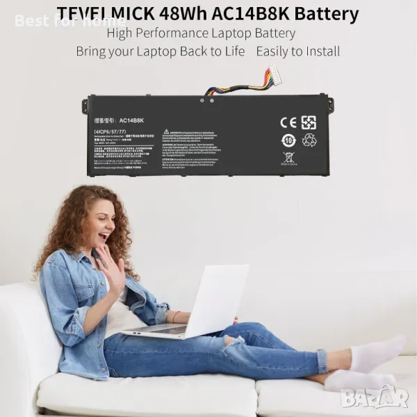 СПЕЦИФИКАЦИЯ: Име на модела: AC14B8K(4ICP5/57/80) Батерия за преносим компютър; Тип батерия: Li-ion; Напрежение: 15.2V; Капацитет : 48Wh/3220mAh; Клетки: 4 клетки; Цвят: Черен; Тегло около 11 oz/ 0,69 lb; Състояние: Ново; Пакетите включват: 1 батерия за лаптоп (със защитна кутия) Клетките от клас A осигуряват бързо зареждане и ниска консумация на енергия.