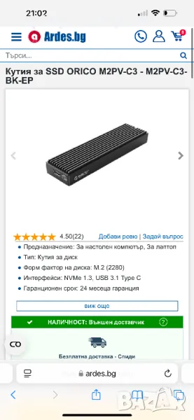 кутия за SSD M.2 за прехвърляне на данни за компютър или лаптоп до 10GBps използван е веднъж и е като нов с неразопакован кабел и оригиналната кутия нов е 77лева