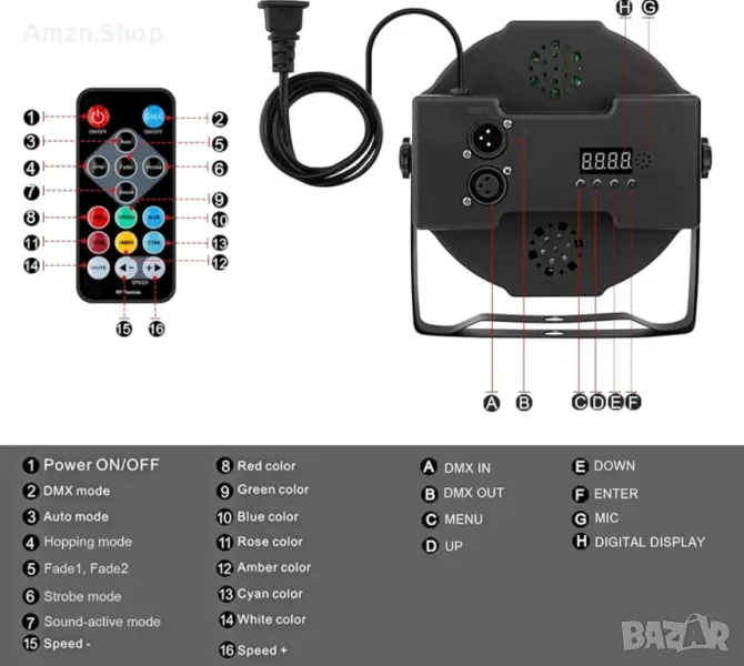 Множество режими на управление: режим на статичен цвят, режим на промяна на цвета, режим на избледняване на цвета, активен режим на звука, режим Master-Slave, режим Auto-Play и DMX режим. Контролирайте скоростта на въртене, цветовете и светкавицата.