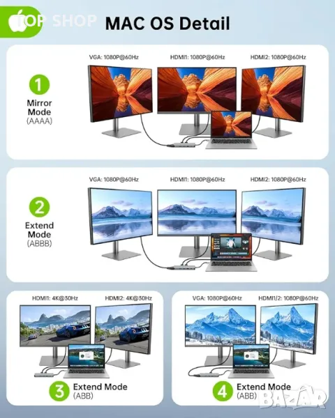 【Докинг станция за 3 монитора】В система Windows този USB C към HDMI адаптер поддържа до 3 монитора за огледален режим или разширен режим. Единичен HDMI 1 или едновременно двоен HDMI може да бъде до 4K@30Hz при DP1.4 източник. Когато е свързан VGA порт, максималната разделителна способност ще бъде 1080P. Забележка за Mac устройства: Тази USB-C докинг станция НЕ МОЖЕ да разшири два различни дисплея поради ограничение на Mac OS.