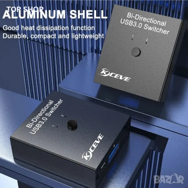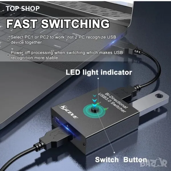 1. С този превключвател USB 3.0 2 компютъра или преносими компютри могат да споделят 1 USB устройство като принтери, скенери, клавиатури, мишки, USB флаш устройства, външни твърди дискове и др.
