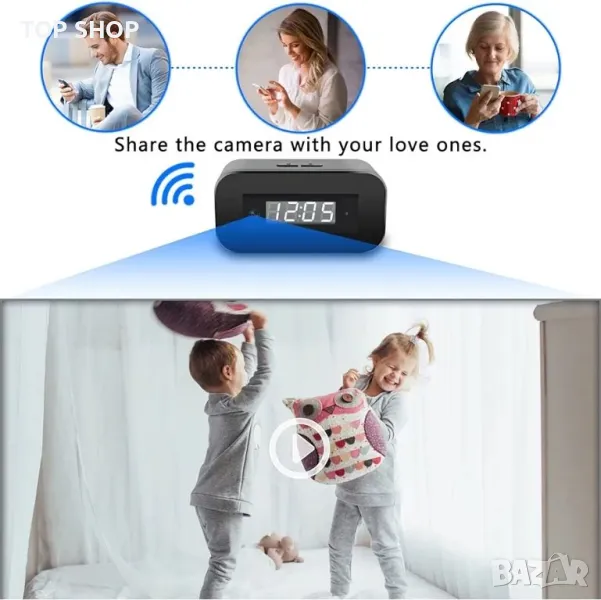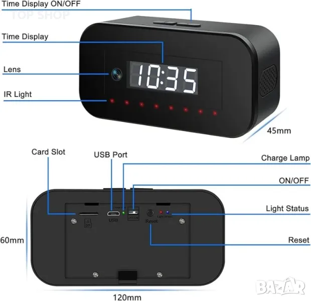 【Аларма за откриване на движение】 След като се свържете с WiFi, можете да включите режима на аларма в настройките на APP (трябва да бъде поставена SD карта). Скритата шпионска камера изпраща предупредителни известия до приложението на телефона, когато бъде открито движение на обект. Камерата с часовник Igzyz поддържа до 256 GB SD карта с памет (не е включена).
