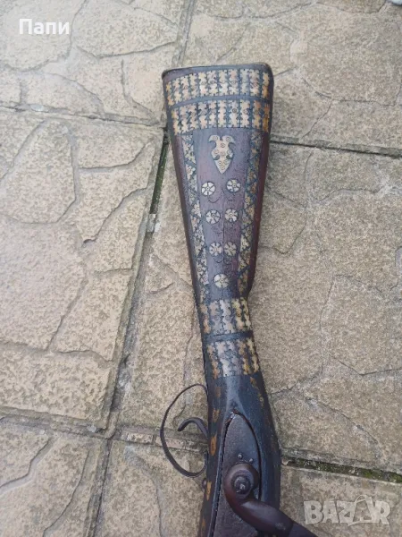 Седефена капсулна пушка от Османската империя,от района на Билад ал Шам. Здрава пружина,зарежда и на двете положения. Без липси на седеф. Тежка,масивна с английски механизъм. Пушаката е подходяща за възстановки,както и за украшение в дома. Без ръжда,с хубава патина,истинско бижу.