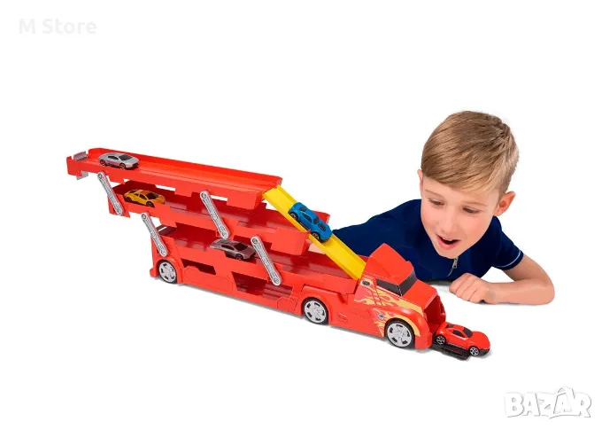 Комплекта съдържа транспортер и пет коли, които можете да местите с негова помощ! Лесен е за конфигуриране и сглобяване, като в същото време е много пристрастяващ, можете да играете с него по безброй начини! С помощта на тези компоненти можете да изградите такава система точно във вашия дом, като вземете дори най-малките детайли от реалните модели, насърчавайки креативността и мисленето чрез наблюдение на наличните елементи, точно като истински автовоз!