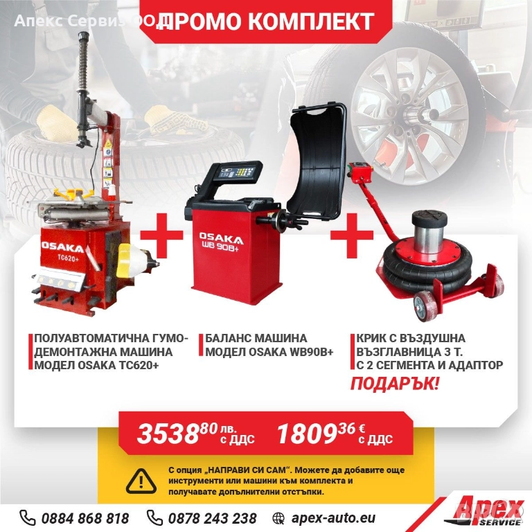 2. Полуавтоматична гумодемонтажна машина модел OSAKA TC620+ + баланс машина WB90В+ с подарък крик с въздушна възглавница 3 Т с 2 сегмента и адаптор: 3 538.80 лв. с ДДС (1809.36 €)