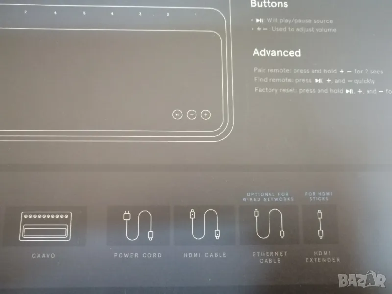 Това разкрива елегантната система за управление на кабелите на Caavo, която се състои от 15 стълба, които поддържат кабелите в една линия. Caavo включва един съвпадащ 3-футов HDMI кабел в „подписано бароло бяло и червено“, схема, която съответства и на другите включени кабели: Ethernet, захранващ, кабел за дистанционно зареждане с адаптер за стена, къс HDMI удължител и два IR излъчвателя.