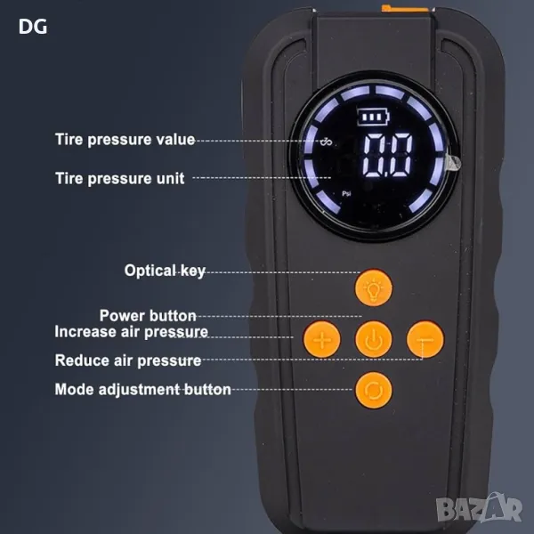 Когато го използвате в режим компресор за гуми, може да изберете желаното налягане, а компресора ще спре сам при достигането му. От големият и ясен дисплей може също така да избирате между помпане на гуми на автомобил, велосипед, мотор или топка.