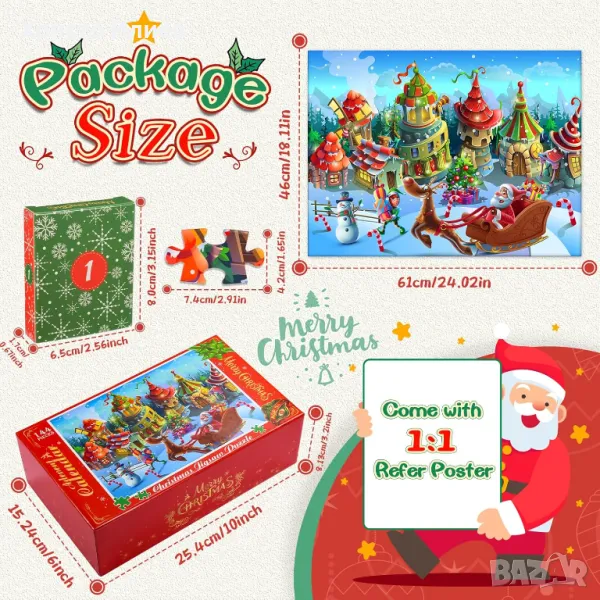 - 24 дни коледно броене: Този пъзел с адвент календар за деца съдържа 24 номерирани кутии с общо 144 части от пъзел и цветен референтен плакат 1:1. Децата могат да попълват част от пъзела всеки ден от 1 до 24 декември и да отброяват обратно броене до Коледа!