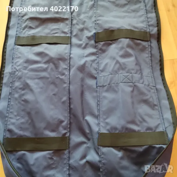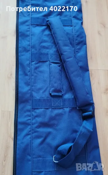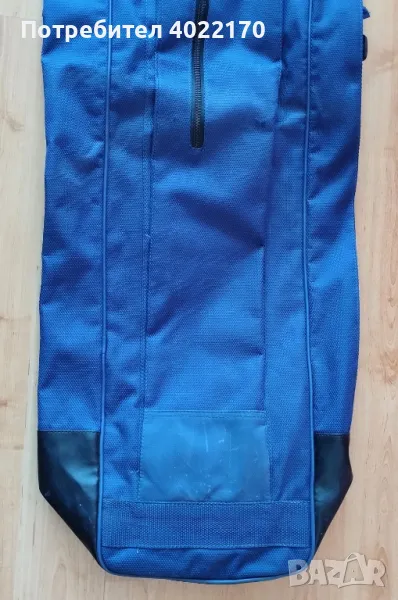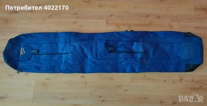 Голям английски калъф за няколко мачови и фидер пръчки с макари, дължина около 175-180 см. От вътре е с ластични прегради, в които може да се поберат няколко пръта. От вън има два джоба с цип и закопчалка, като единият е с дължина около 154 см, в който може също да се побере прът, но най-вероятно е за колове, стойки, триноги, чадъри или други аксесоари. Вторият е с дължина около 84 см и пак може да се побират дълги аксесоари. Платът е промазан-водонепропусклив. От зад има дълга удобна и мека презрамка и мека дръжка за носене. Калъфът е в много добро състояние, малко използван, единствено от долу на кожата има следи от употреба, но от вътре е с двойно дъно и забележките, които се виждат са само повърхностни, също и единият цип е без дръжката на машинката, но и така си работи без проблем. Купуван е от Англия.