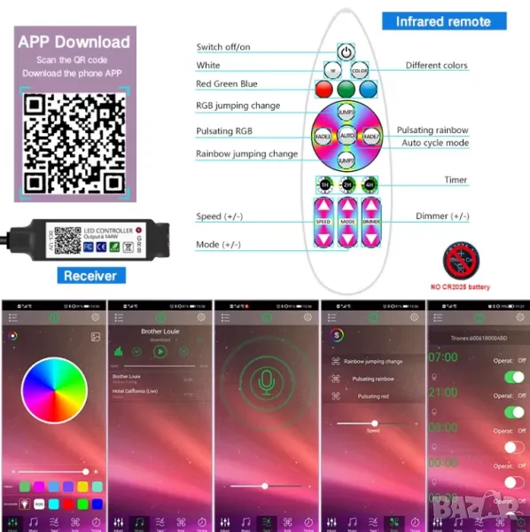 - Със стабилна bluetooth връзка, контролирайте своите LED светлини, променяйте свободно 16 милиона цвята, регулирайте яркостта, персонализирайте режимите (мигащи, скокове, избледняване и т.н.) с различни скорости. можете също така да си направите сам Led светлини с уникални цветове, за да осветите живота си.
