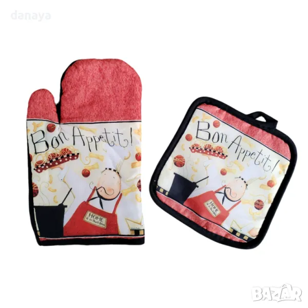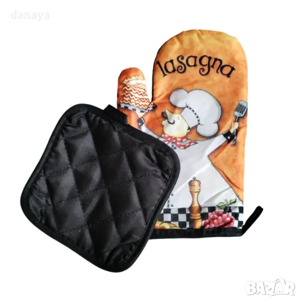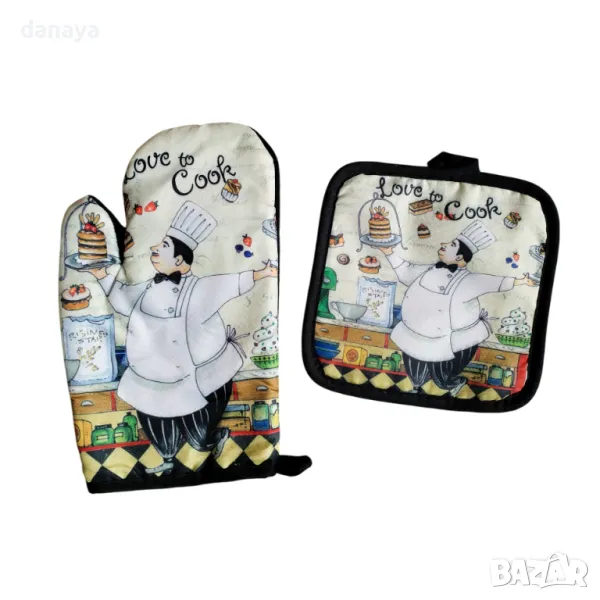 Комплект кухненска ръкохватка и ръкавица с различен принт на готвачи. С тях готвенето ще бъде още по-приятно. Вътрешната част е с пълнеж от негорима вата, а външната – полиестерен плат. Безопасно хващане на горещи предмети с диапазон от -30 до +200 градуса! Ръкохватките имат приспособление за закачане.