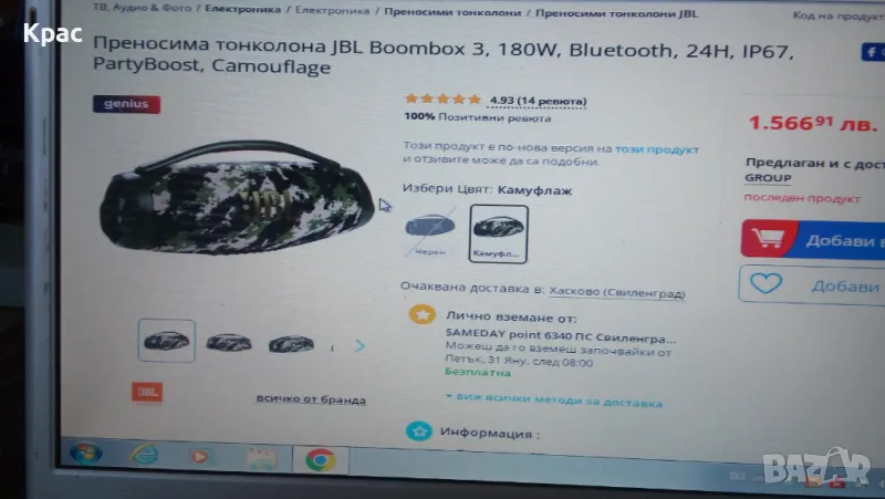чисто нова във кутията си само е пробвана много мощна силен и чист звук, водоустойчива и удароустойчива,много издържлива батерия, марка и модел на снимките