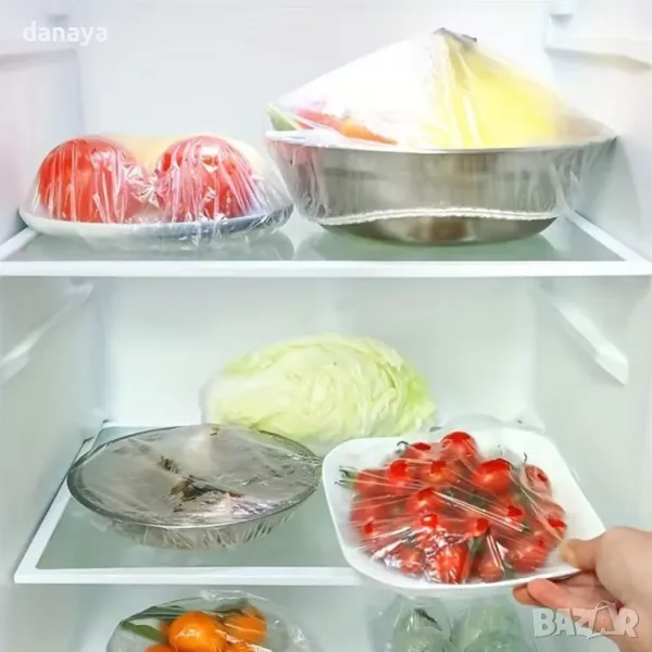 Найлонови торби тип капак с ластик за свежо съхранение на хранителни продукти. Найлоновите капаци с ластик са чудесен начин да съхранявате свежи хранителни продукти и готова храна. Те са подходящи за съдове с различна форма, прилепват идеално и не позволяват проникване на въздух от външната среда. Свалят се лесно. С тях можете лесно да защитите съдове като чинии, купи, тенджери или различни, хранителни продукти за запазване на свежестта и качеството за по-дълго време. Помагат и за ограничаване на нежелани миризми в хладилника. Изработени са от безопасни за храни материали с прозрачен дизайн с цел да се вижда по-лесно съдържанието им. Независимо, че са изключително тънки при внимателна употреба могат да се използват многократно.