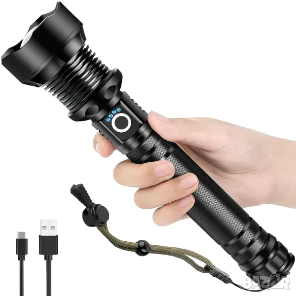 Фенерът P90 Power Light с функция Power Bank притежава елегантен дизайн в черен матов цвят. Изработен от авиационен алуминий, той е здрав, масивен и изключително устойчив. Оборудван е с висококачествен Cree XHP70.2 диод, който има дълъг живот до 100 000 часа. Фронталната светлина преминава през мощна лупа и предлага три режима на работа: силен, стандартен и SOS сигнал. С едно бавно натискане на гумирания бутон се активира силният режим, с второ натискане - стандартният, с трето - SOS сигналът, а с четвърто натискане фенерът се изключва. Зареждането става чрез USB кабел Type-C/USB 2.0, а фенерът разполага с индикатор за нивото на заряд на батерията. При обръщане на кабела за зареждане, фенерът може да се използва и като мощна преносима батерия Power Bank.Фенерът е оборудван с две литиево-йонни батерии тип 26650/4.2V с капацитет от 8800 mAh. В комплекта са включени и две адапторни касетки, които позволяват използването на батерии тип 18650. Моделът е универсален и е отличен помощник за лов, риболов, туризъм, походи и други активности на открито.