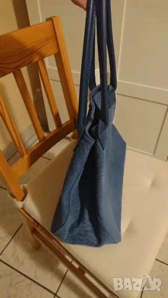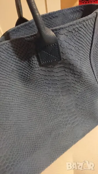 Дамска чанта от естествена кожа, цвят "сини джинси", размери 16см/47см/28см. Шарката на кожата е тип"змийска", може да се носи в два варианта, както се вижда на снимките. Настоящата ѝ цена в магазина е 99 лв.Продавам я за 65 лв.