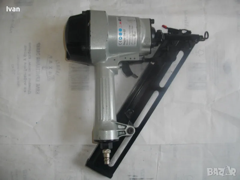 ОПИСАНИЕ на сив голям индустриален пневматичен такер за пирони 32-64мм. Голям, масивен пневматичен такер тип индустриален, работещ на компресор сгъстен въздух, за пирони голям размер от 32 мм до 64 мм. Пироните са специализирани - тип 34 грасуса, на блистер. Продават се в онлайн и физически магадини в България на кутии, с 2 500 бр , на средна цена 80 лв. Пироните трябва да са Prebena Senso 34 градуса.