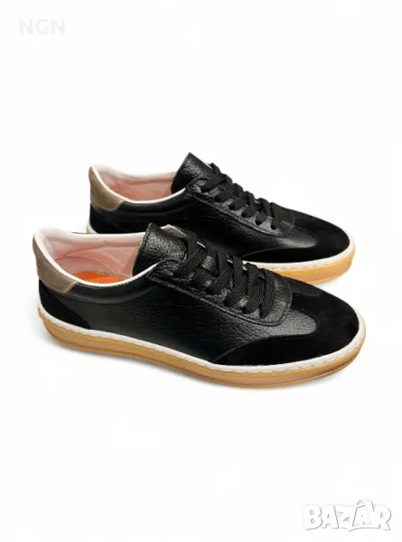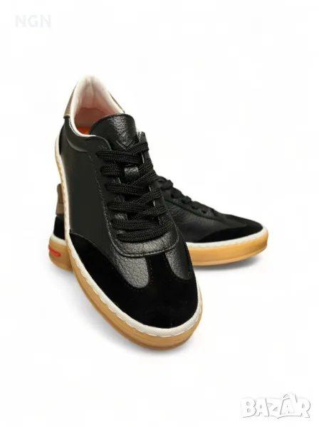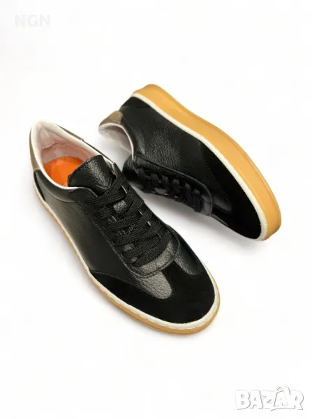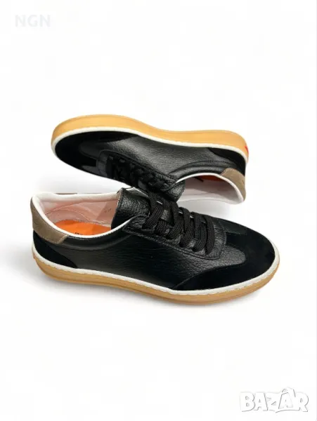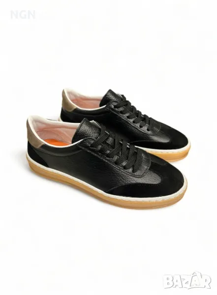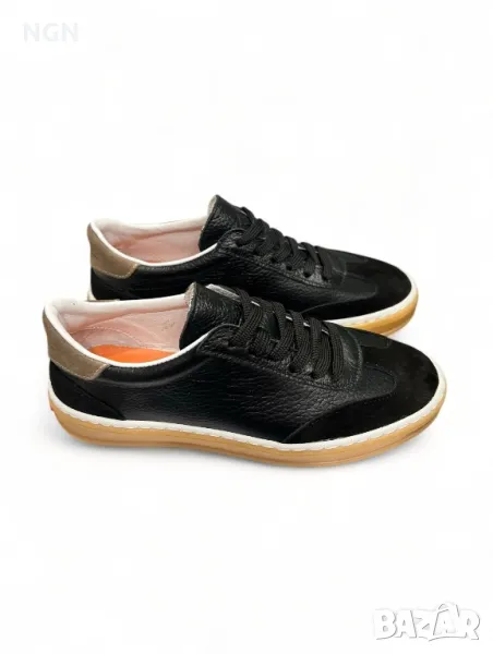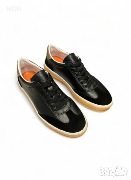 Уникален модел дизайнерски дамски сникърси с модерен италиански дизайн. Модел изработен от висококачествена естествена кожа в комбинация с естествен велур, в класически черен цвят колекция пролет-лято 2025г. и стелка от естествена кожа с мемори пяна. Супер леки, комфортни и удобни. С дизайнерско лого на петата.