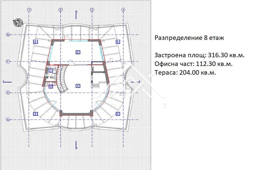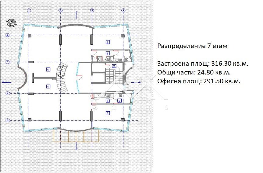 Сградата е реализирана на 8 етажа с офис площи, сутерен с паркоместа, сервизни и технически помещения партерен етаж с фоайе, заседателни зали, от първи до седми етаж офис площи с еднакво разпределение, етаж 8 отворено общо пространство с панорамна тераса. Всеки етаж е със застроена площ на етаж от 316.30 кв.м. до 379.22 кв.м.Разпределенията на етажите от първи до седми са отворени пространства с два самостоятелни кабинета, два санитарни възела, самостоятелна кухня. Етаж 8 е изцяло отворено пространство с панорамна тераса.