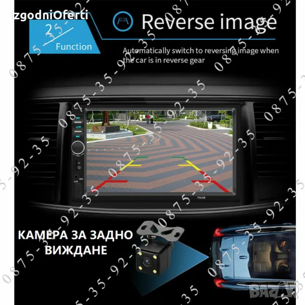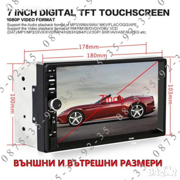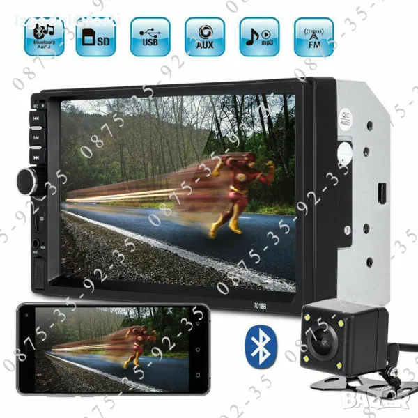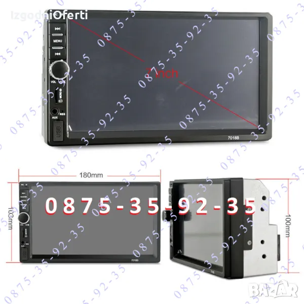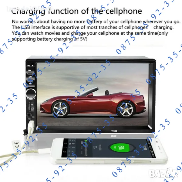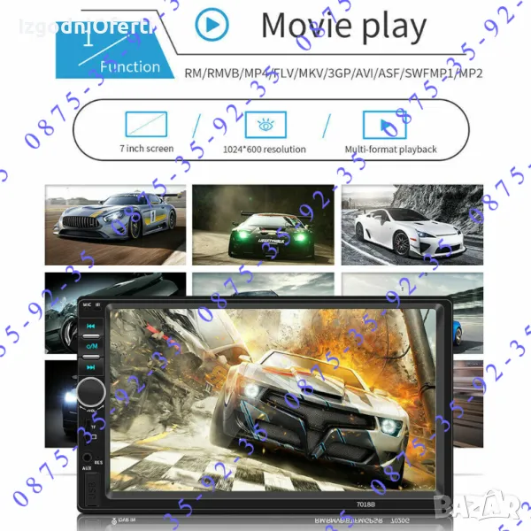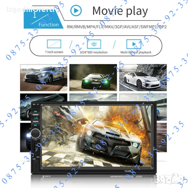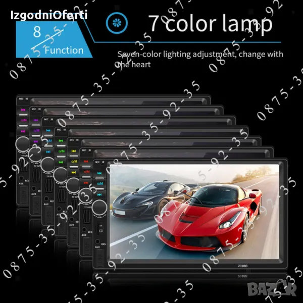 MP 5 устройство на изключително бюджетна цена! Предлага ви всичко необходимо от което се нуждаете, докато сте на път. Разполага с голям 7 инчов TOUCHSCREEN display с висока резолюция, гледане на филми и клипове с ВИСОКОКАЧЕСТВЕН ЗВУК И КАРТИНА, вграден микрофон и BLUETOOTH, така че вече имате Handsfree в автомобила си. Може да копирате екрана на телефона върху дисплея на мултимедийното устройство и да ползвате всичките си приложения и карти на голям екран - Google maps, Waze, You Tube и т.н. Когато някой ви търси устройството прекъсва музиката или филма и чувате говорът в говорителите на колата ви. Вие си говорите свободно без да се налага да отделяте ръцете от волана, благодарение на вграденият в устройството микрофон. Може да избирате телефонни номера (контакти) директно от мултимедията. Освен това устройството може да чете всички видове видео и музикални формати, има вграден радио приемник с автоматично сканиране на ефира и запаметяване на станциите, може да ИЗБИРАТЕ ОТ МЕНЮТО цвета на подсветката според интериора на автомобилът ви (важно! всяка медия поддържа всички цветове и вие си избирате един от менюто),може да зареждате телефонът си през пригоденият за целта USB изход, може да сдвоявате мултимедията с телефона си или да я управлявате от мултифункционалният си волан. Системата има AUX функция, поддържа USB flash памети и TF (SD card) до 128GB, Bluetooth функция, FM функция и всичко това може да управлявате от IR дистанционно управление от разстояние до 10 метра. Когато включите на задна предавка медията автоматично превключва екрана за гледане назад. Моделът е изпитан във времето и много сполучлив. Със чудесни отзиви от клиентите. Последна версия на модела 7010B с най-новите подобрения и фърмуер.