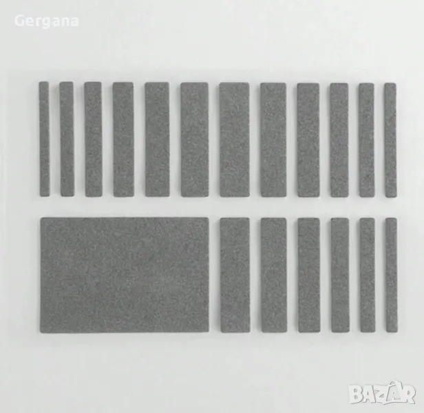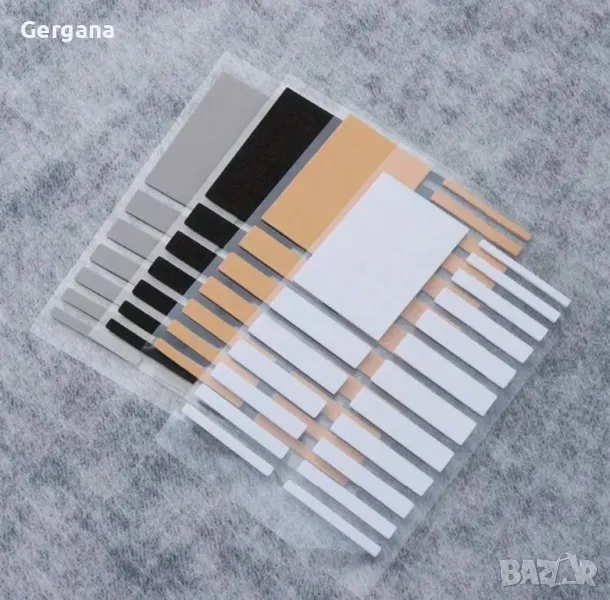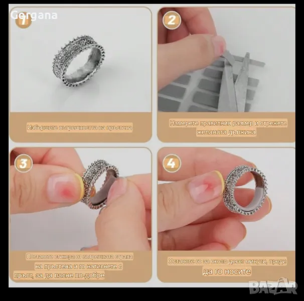 Включва подложка с различна ширина плътни стикери, които да паснат на всеки размер пръстен(ако не намирате точен размер има и голям стикер от който може да отрежете желаното количество)