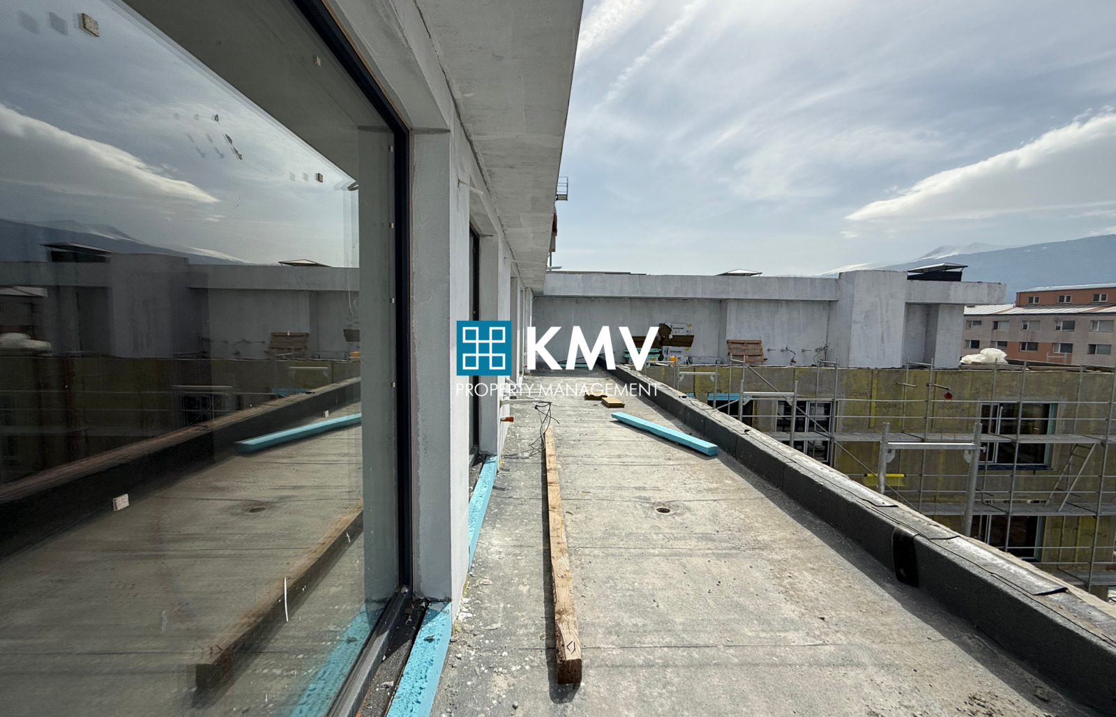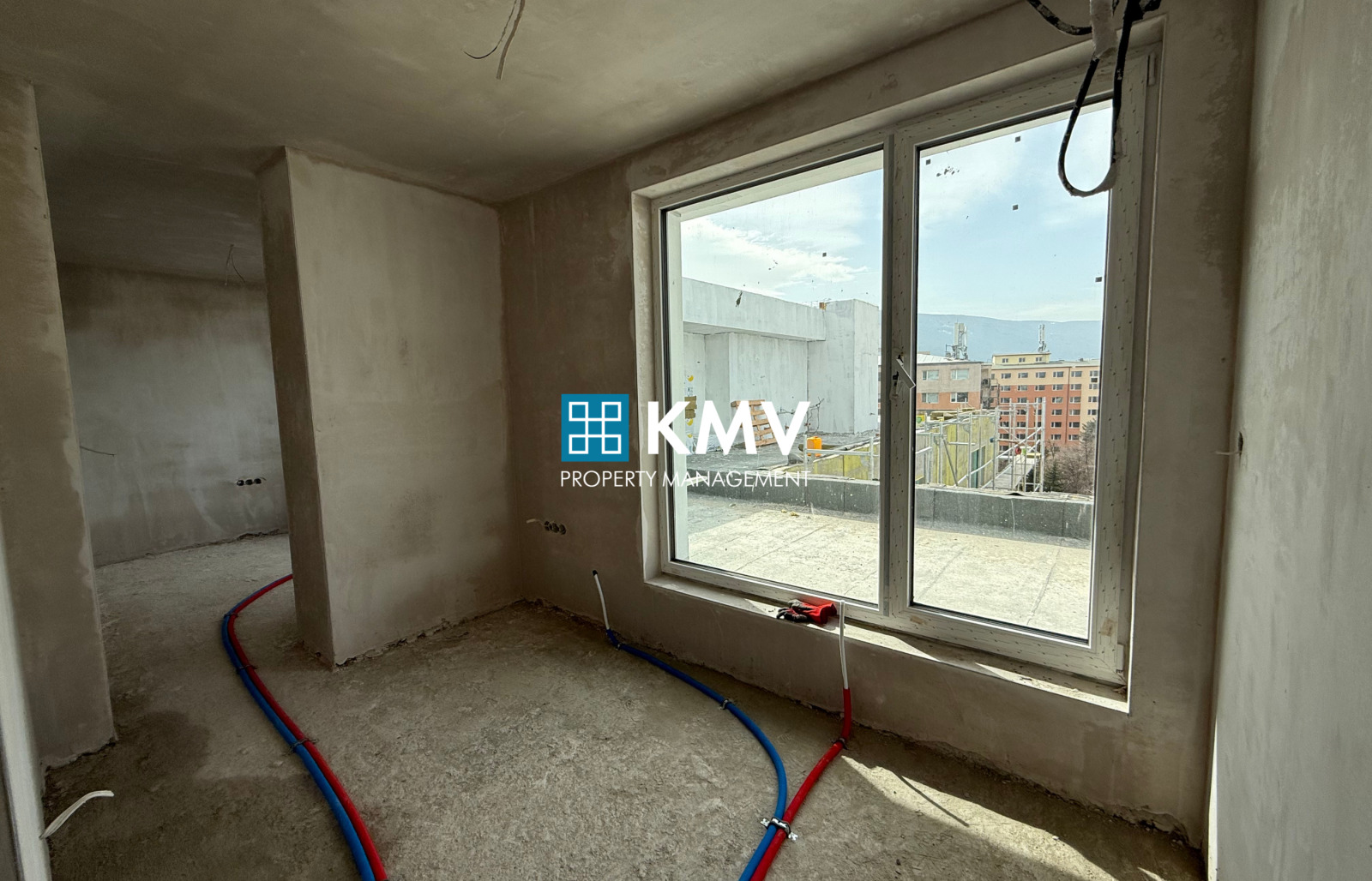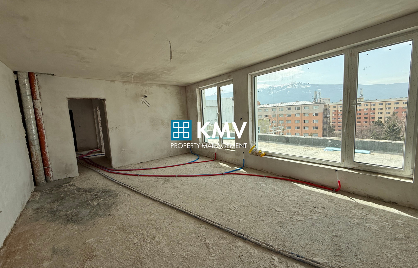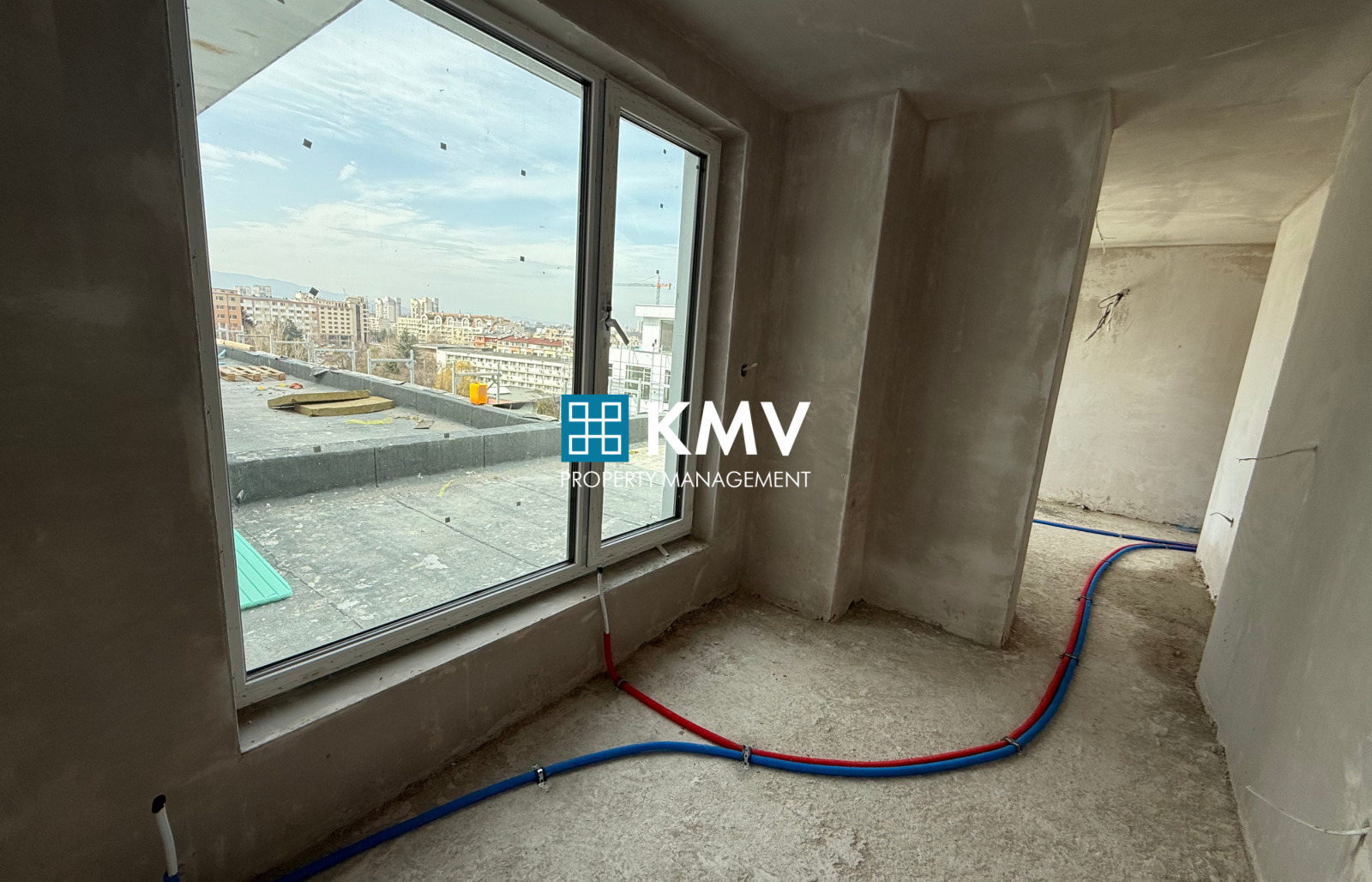 Имотът се намира на 8-ми жилищен етаж от общо 8 етажа и е със застроена площ от 129,78 кв.м., като се състои от: входно антре, дневна с кухненски бокс, две спални, баня с тоалетна и балкон 44,81 кв.м. Изложението на имота е запад.