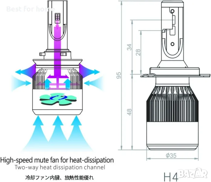 Макс. Номинални лумени: 7200lm/чифт (3600lm/крушка), Работни лумени: 3000lm±100lm/PC, 6000lm±200lm/чифт. Вентилаторите в долната част на крушката освобождават топлината по-бързо