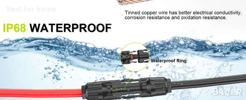 【Здрава конструкция】: Кабелът за съединители на слънчевите панели е изработен от висококачествени материали, кабелът за съединители на сплитер е изграден така, че да издържа на тежките условия на използване на открито и суровите условия на околната среда. Отличаващи се с водоустойчиво ниво IP68, калайдисана медна сърцевина и висококачествен PPO материал, тези конектори са нетоксични, устойчиви на износване, забавящи горенето и UV устойчиви. Неговата здрава конструкция гарантира дълготрайност и надеждност, осигурявайки постоянна работа при различни климатични условия.