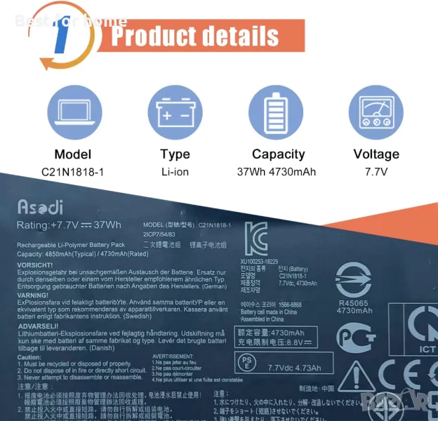 <3>Съвместим P/N: C21N1818-1, 0B200-03280800, 2ICP7/54/83. (Важна забележка :Има два типа батерии: C21N1818 и C21N1818-1, те не са съвместими една с друга. Моля, проверете оригиналната батерия на вашия лаптоп, преди да направите поръчката. Този списък, който продаваме, е C21N1818-1.)