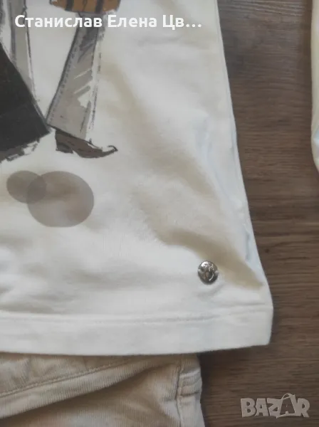 Дамски/юношески бежави джинси Майорал, размер по етикет 18, закопчаване с цип и тик так копче, с еластан. Обувани са два-три пъти, като нови. Към тях блузка Майорал, размер 18, с еластан и отпред и отзад е с момиченца. Цената е за двете неща!