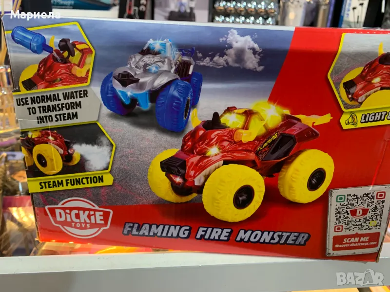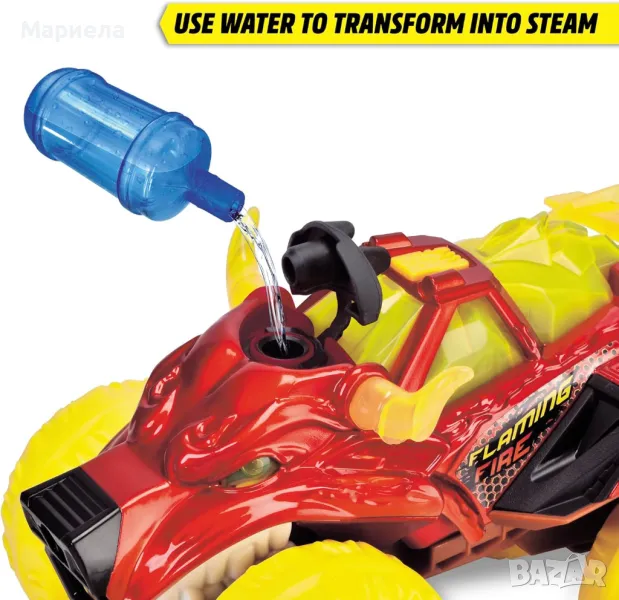 Когато колата играчка се напълни с приложената бутилка с вода, чудовищният камион изпуска фин воден дим и симулира подобен на чудовище огнен дъх.