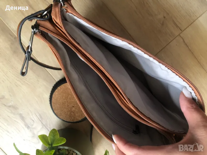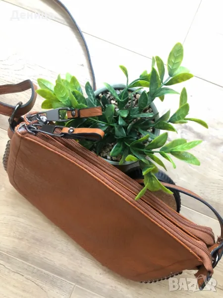 Кафява чанта през рамо, купувана от Deichmann, носена е броени пъти. Има две отделения с ципове, отделно вътре има малък джоб с цип за ключове, телефон и т.н. Дължината на дръжката се регулира, размери 27х19см. Цена 13евро, чантата е като нова.
