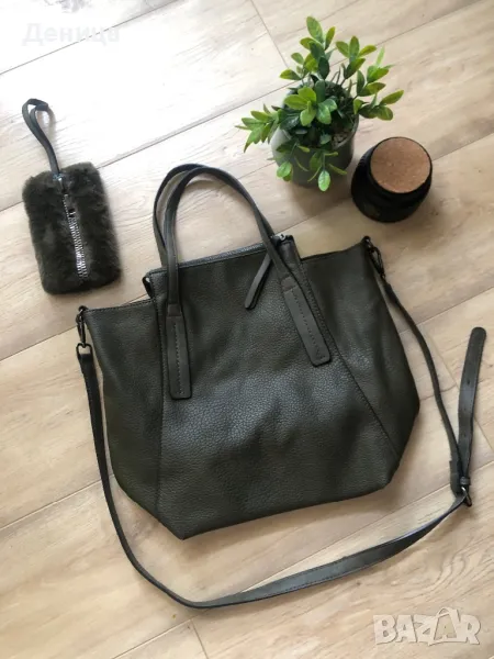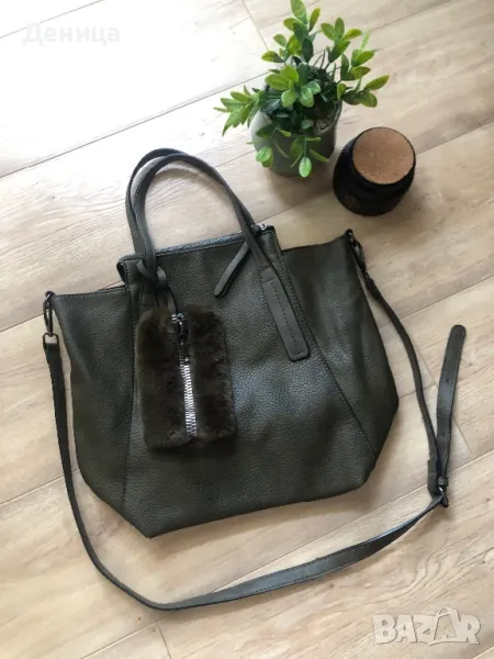 Тъмно зелена чанта с къси дръжки и дълга дръжка, която се регулира, може и да се маха. Има пухкаф аксесоар, който също се сваля. Вътре има малки джобчета. Може да се носи по 2 начина, вижда се на снимките. Чантата е на Paolo Botichelli. Размери 34х39см. Цена 10евро.