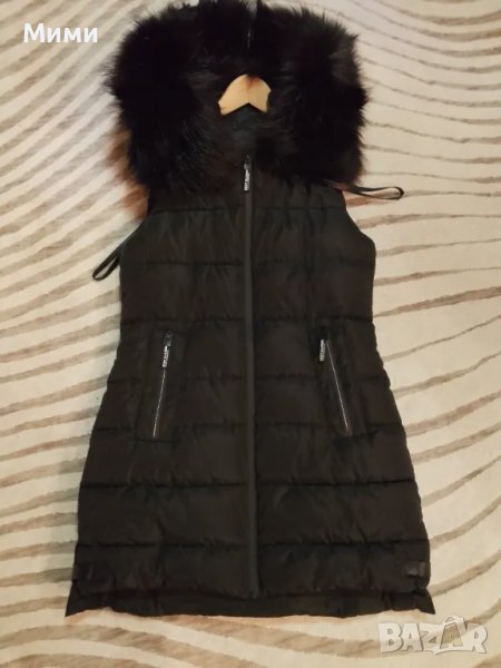 Дълъг зимен елек със свалящ се пух на качулката, по етикет е размер М, но според мен е умален и отговаря на S. Произведен в Турция, високо качество