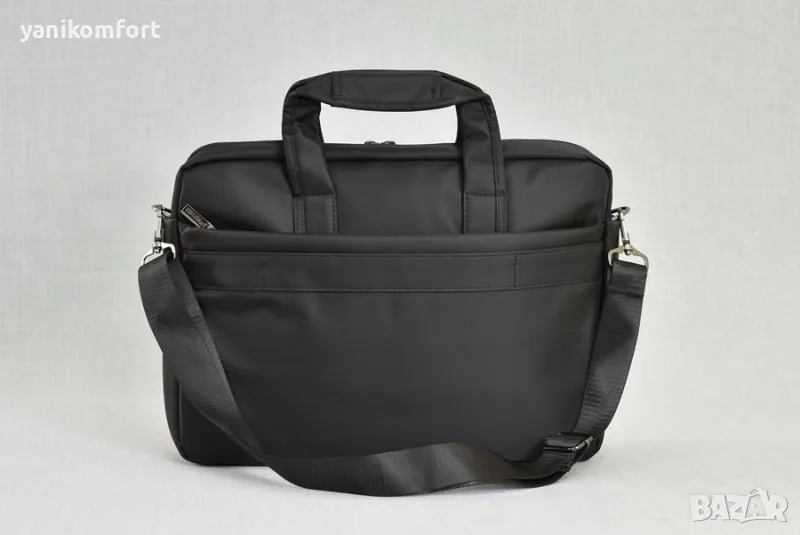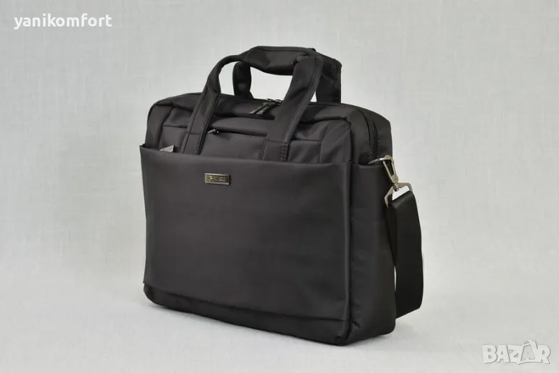Бизнес чанта от текстил с отделение за лаптоп и колан на гърба за поставяне върху дръжката на куфар.Има два външни джоба от лицева страна, джоб на гърба с ципи отделна дръжка за рамо.Размери: 39 х 28 х 8 см.