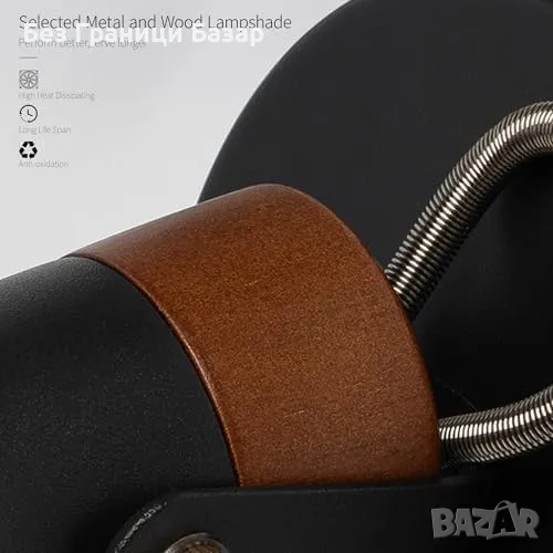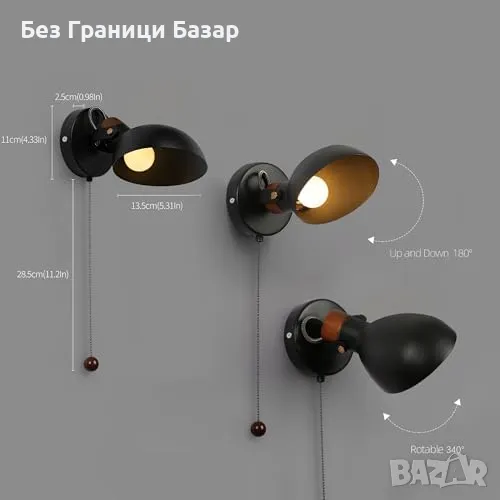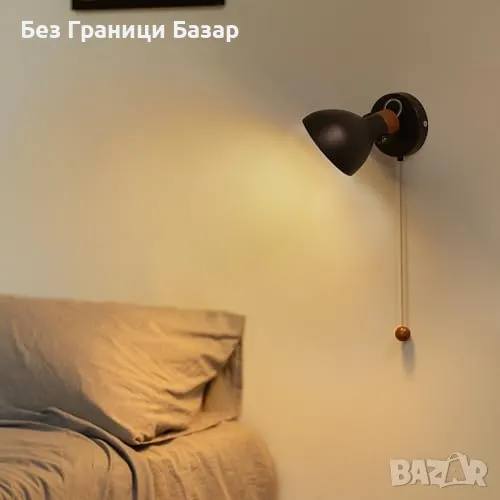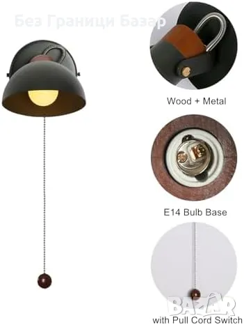 Нова Черна стенна лампа с дървена основа и издърпващ ключ, E14 база