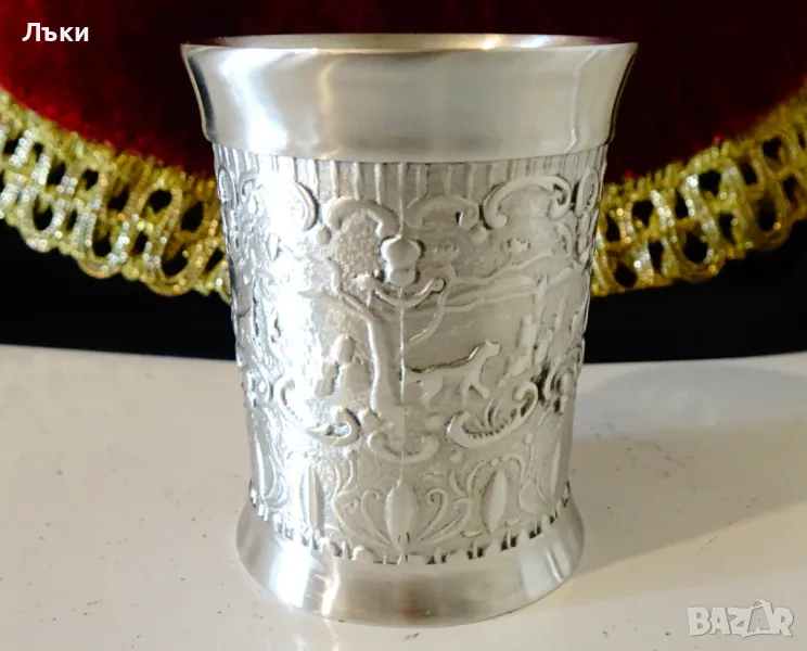 Старинни немски чаши за ракия,ликьор,шот,майсторска ръчна изработка от 95% калай и 5% сребро,маркирани от производителя.Декорирани с релефно гравирана ловна