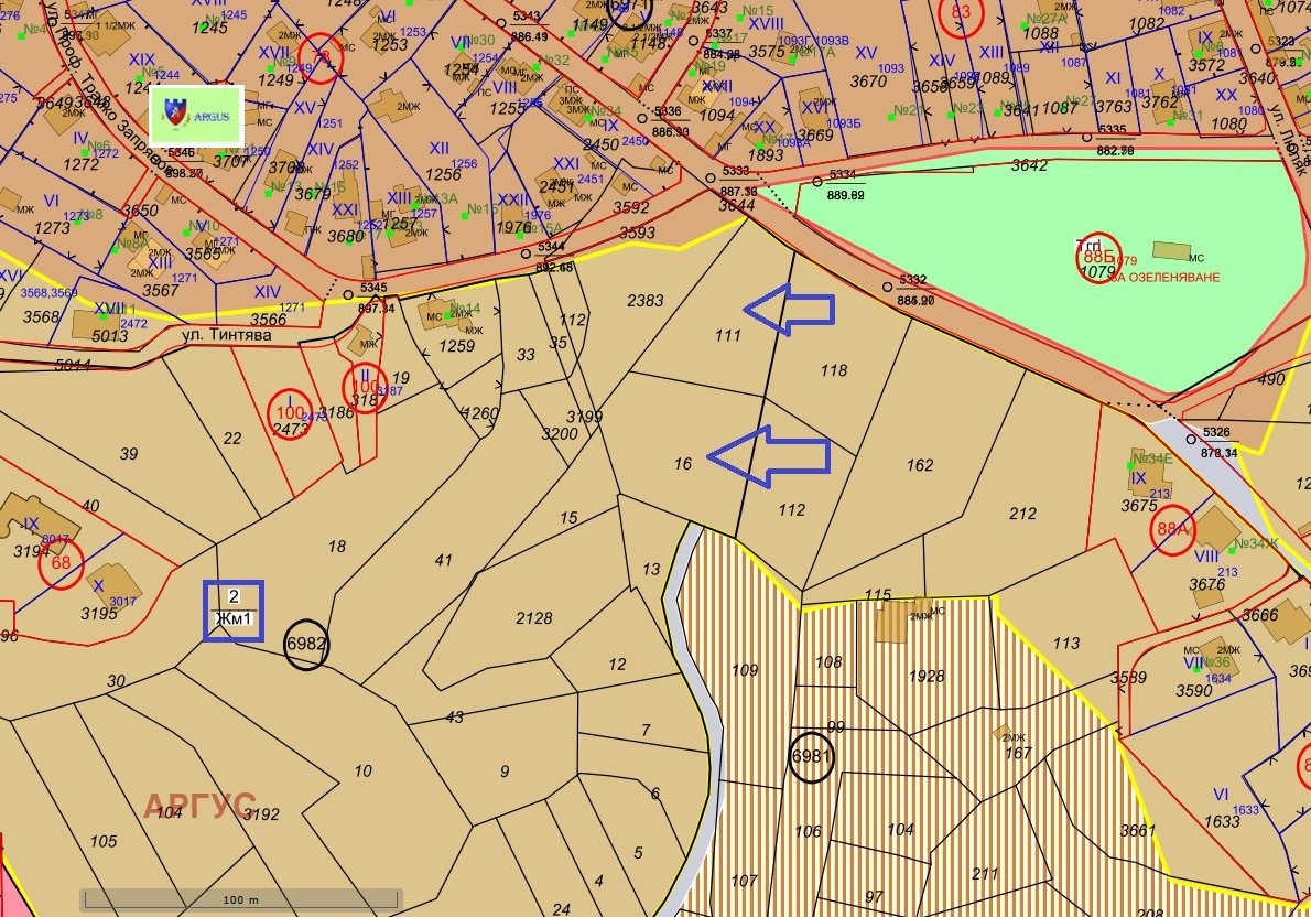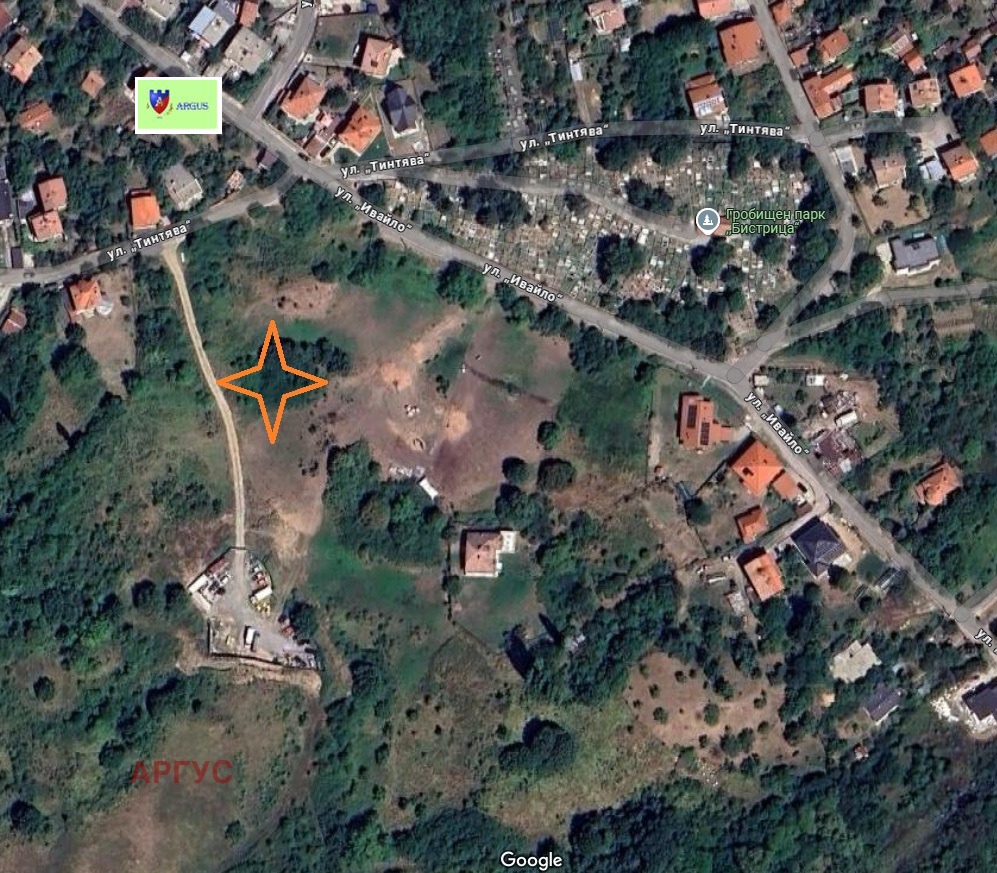Агенция АРГУС продава ОТЛИЧЕН ПОЗЕМЛЕН ИМОТ в нов квартал, който се оформя в карето между ул. Ивайло и ул. Тинтява. Лицето му е 30 м. към път, водещ до две новостроящи се къщи, който път е пресечка на ул. Тинтява. Одобрена улична регулация! При желание този имот може да се окрупни със СЪСЕДЕН ИМОТ с площ 1630 м2, т.е. обща площ 3580 м2.. Той е с трапецовидна форма и лице 22 м лице към ул. Ивайло. И двата поземлени имота попадат в устройствена зона Жм1. От тях се открива хубава панорама на юг към Витоша, на изток към Лозенска планина, а на север тя буди особен философски размисъл /в тази посока се намира гробищният парк/!