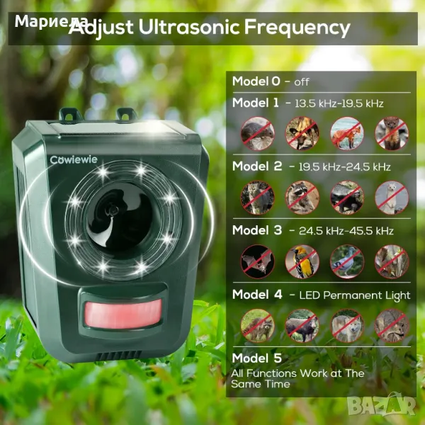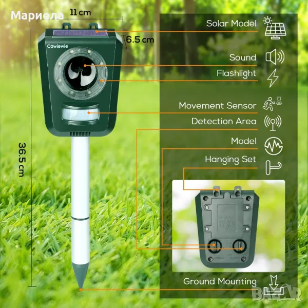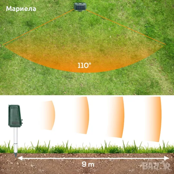 Ултразвуковият прогонващ животните на открито ще отблъсква животните от ефективно разстояние чрез излъчване на силно LED светлина и вграден звук. Има 5 различни честоти за избор за звук !Максималното ефективният обхват е около 104 квадратни метра, а ъгълът на сензора е 110. Репелентът за животни на открито се захранва от слънчева енергия и акумулаторни батерии. можете също да го зареждате с адаптер 5-12V, подходящ за места, където е трудно да се осигури захранване, като ферми, градини, тревни площи, разсадници, имения и овощни градини.