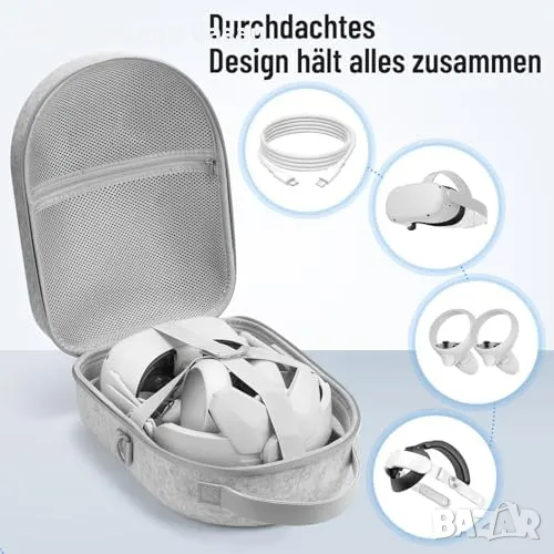 калъф, проектиран за Quest 2, с отделни отделения за VR слушалки, контролери и адаптери.