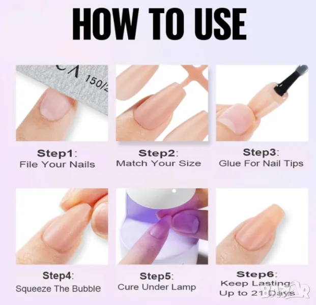 Многофункционално лепило за нокти е подходящо не само за залепване на върховете на ноктите, но може да се използва и като основен гел, гел за подсилване на ноктите, разтвор за плъзгане за нанасяне на полинокти, гел с кристали. Съвети: трябва да се изсуши под LED или UV лампа(включена в комплекта)
