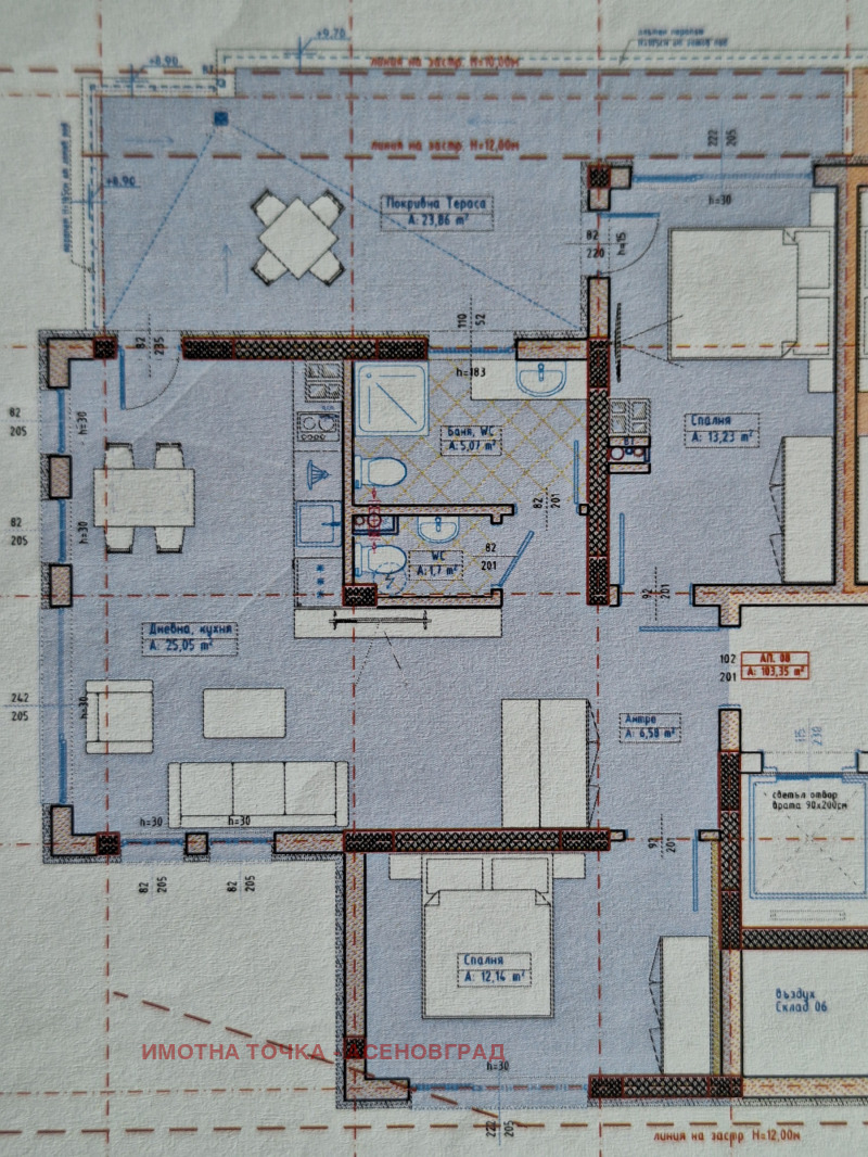 Тристаен апартамент в нова луксозна жилищна сграда. Жилището се състои от просторна дневна с кухненска част и трапезария с площ 26кв.м., две спални по около 13кв.м., баня с тоалетна, тоалетна и една панорамни тераса- веранда с площ от 24кв.м..