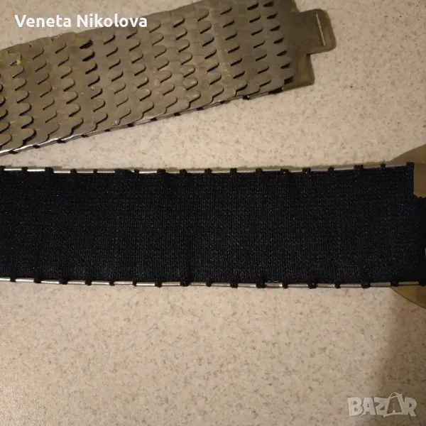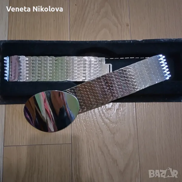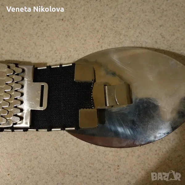 Дамски метален колан тип рибени люспи, еластичен, с черна подплата. Дължина 60 см и ширина 4,5 см. Удобен и модерен избор за всеки повод.