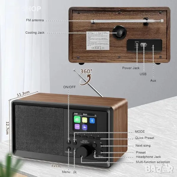 цифрово радио DAB/DAB+/FM предлага разнообразен избор с автоматично/ръчно търсене, лесен за настройка и използване. 2,4-инчовият цветен TFT екран може да показва менютата на каналите и програмите по по-графичен начин в главното меню за по-лесна конфигурация и навигация. Уникален дървен материал за създаване на класически ретро Bluetooth високоговорител.