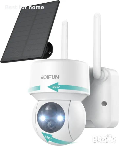 𝐏𝐈𝐑 𝐌𝐨𝐭𝐢𝐨𝐧 𝐃𝐞𝐭𝐞𝐜𝐭𝐢𝐨𝐧 & 𝐒𝐨𝐮𝐧𝐝/𝐋𝐢𝐠𝐡𝐭 𝐀𝐥𝐚𝐫𝐦 - BOIFUN слънчева външна безжична камера за сигурност приема надграден AI алгоритъм от трето поколение и PIR сензор, което значително подобрява разпознаването на хуманоиди и намалява фалшивите аларми, причинени от листа и насекоми. След като функцията за звукова и светлинна аларма е включена, ще се издаде алармен звук от 110db, когато някой бъде открит, за да ви помогне да изплашите натрапниците. 360° пълен зрителен ъгъл PTZ слънчева охранителна камера