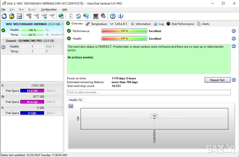 Хард диск: 250GB в перфектно здраве! 100%!