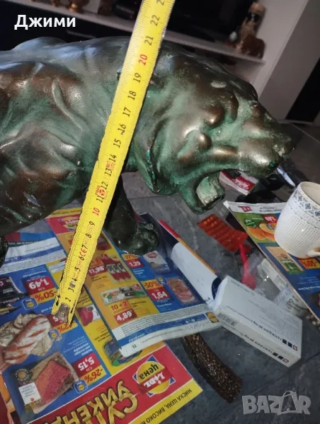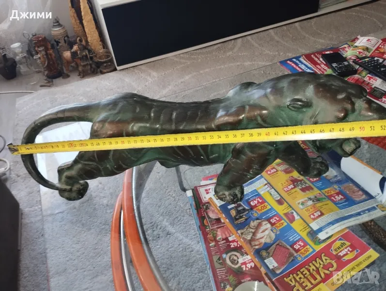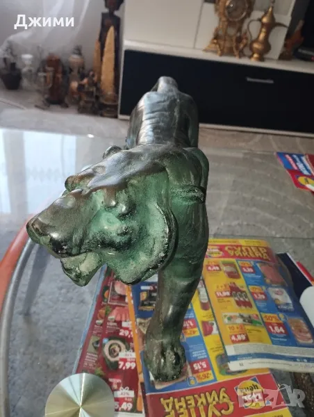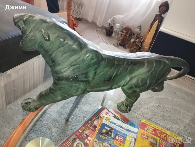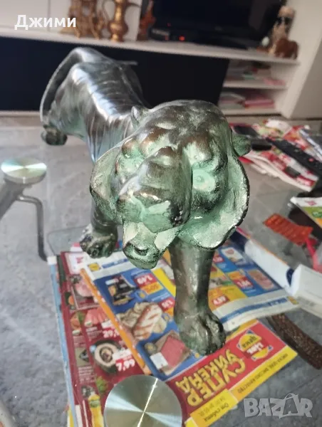 много голям и перфектно изработен тигър дължина 52 см височина 21 см излъчващ сила и мощ не е от бронз но изглежда едно към едно като бронз