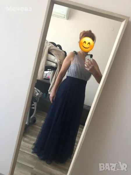 Красива рокля в тъмно синьо и сиво с бюстие в сребристо Дължина 150см Гръдна обиколка 37см Бюстието е чашка В С подплата В перфектно състояние/обличана веднъж/