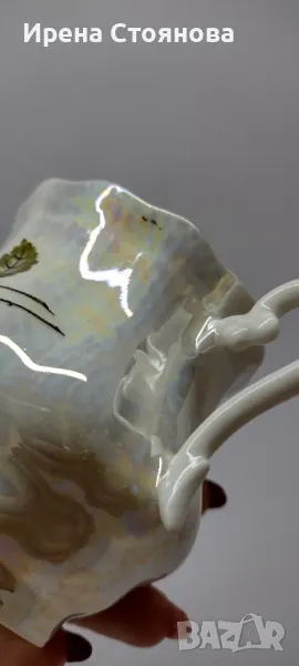 Фин и нежен порцелан с преливащи, седефени нюанси, декор рози и златен кант, лек бароков релеф.
